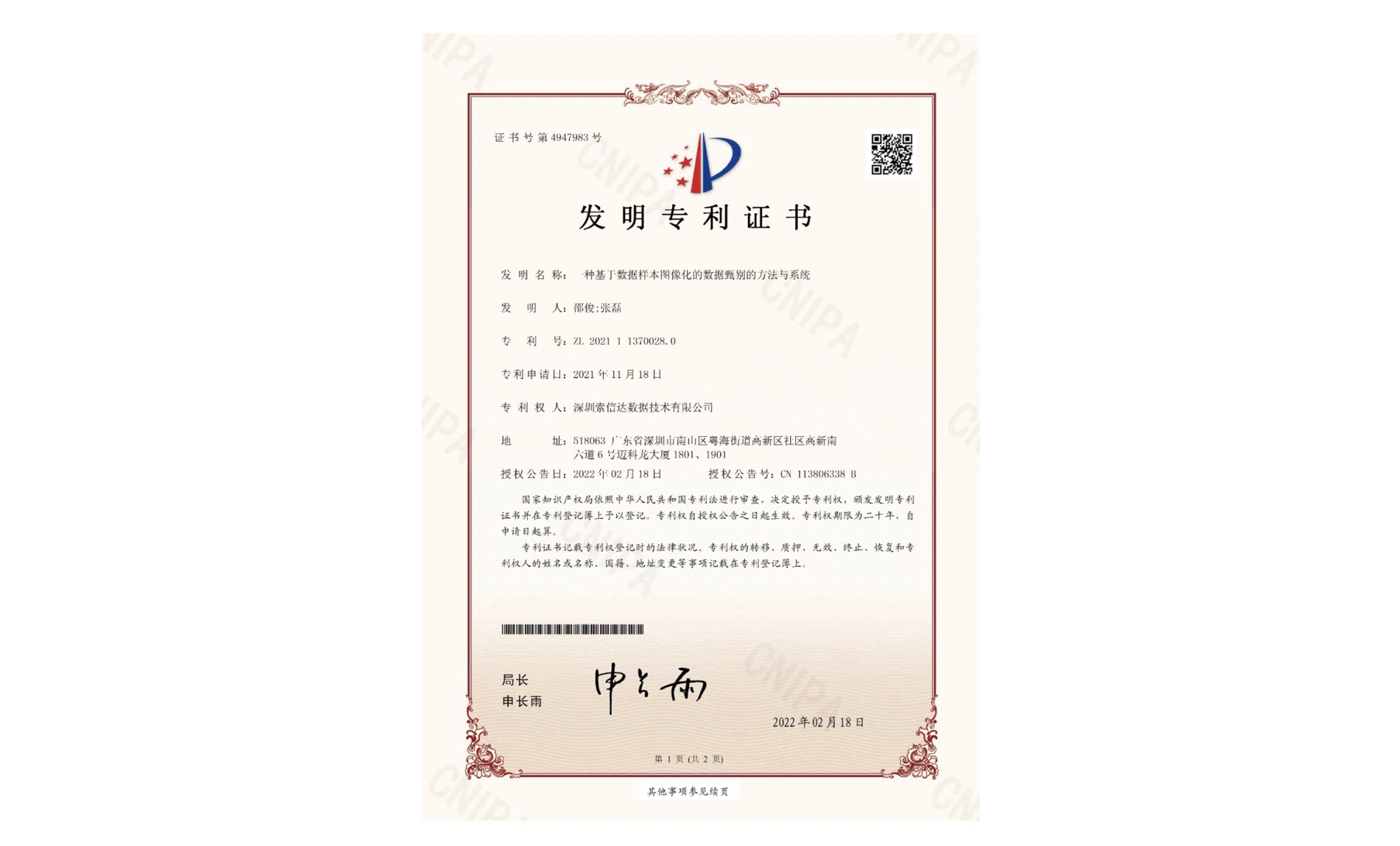 近日,索信达控股有限公司(以下简称“索信达”)在技术自主知识产权方面又取得新突破,由其旗下的深圳索信达数据技术有限公司自主研发的“一种基于数据样本图像化的数据甄别的方法与系统”,获得国家知识产权局颁发的发明专利证书。此项发明专利与之前已获得授权的发明专利“一种基于用户群微细分的信息推送方法及系统”,共